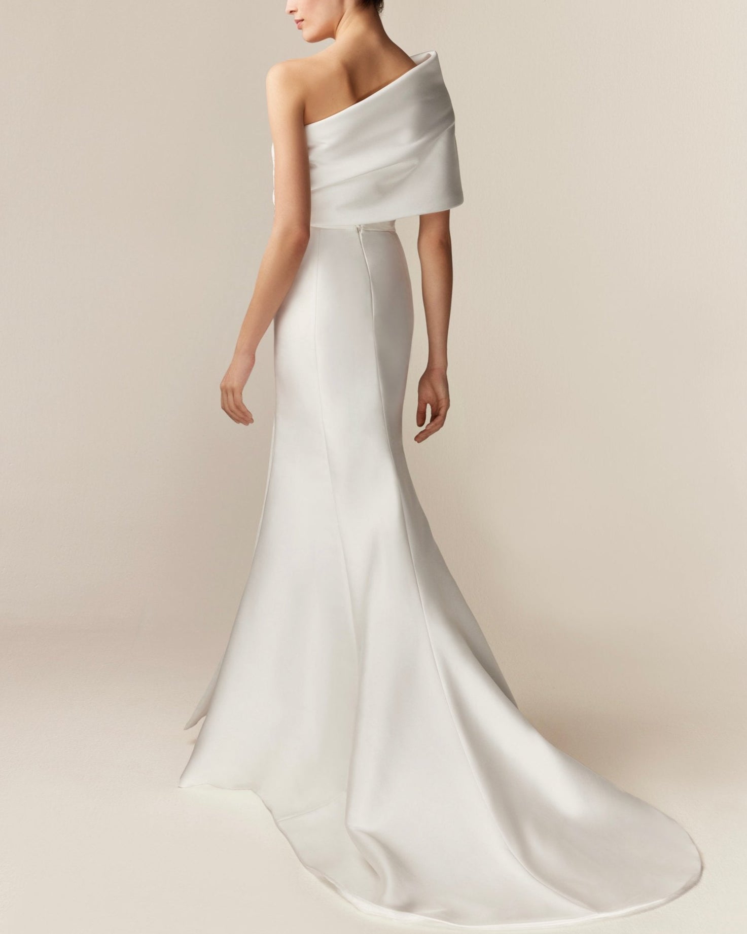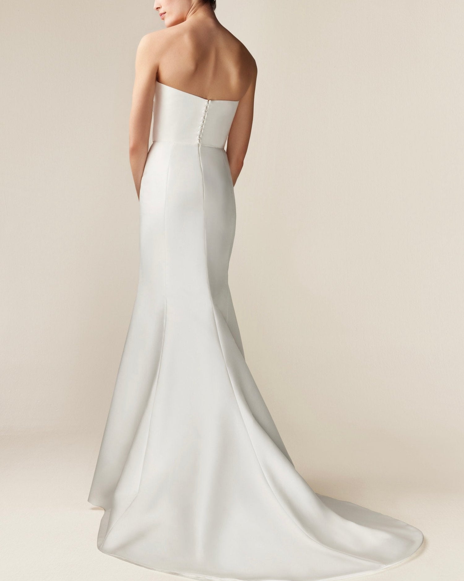 Vestido strapless corte recto, con drapeado en parte superior, con complemento asimetrico estructurado
