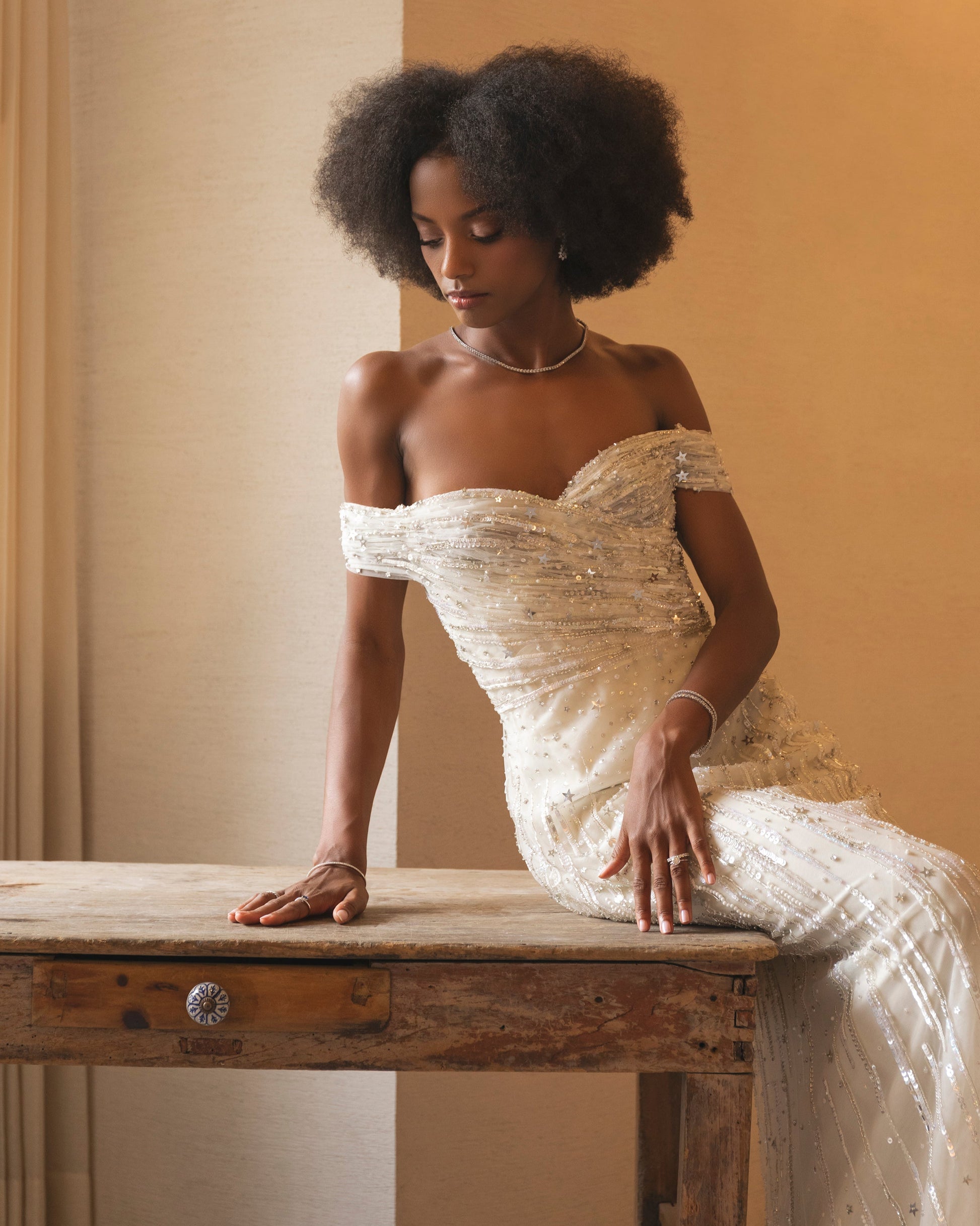 Vestido off-shoulder con aplicaciones de pedreria tipo estrella
