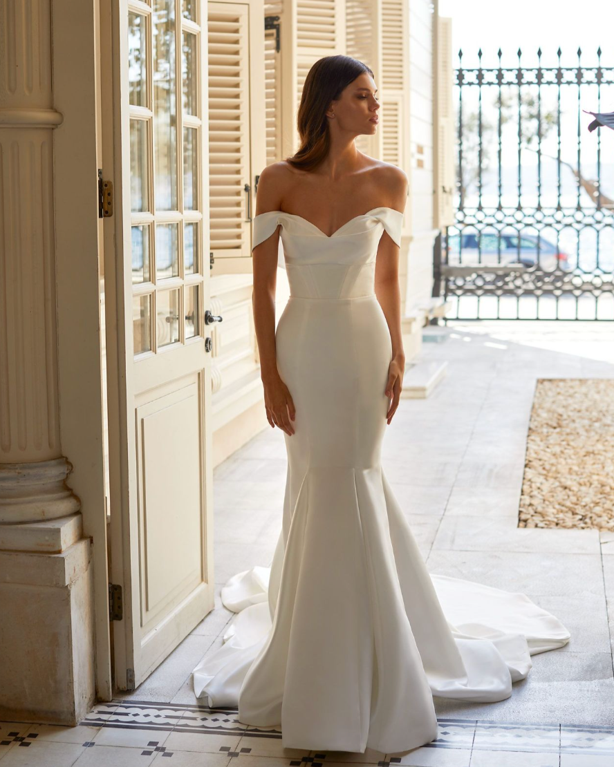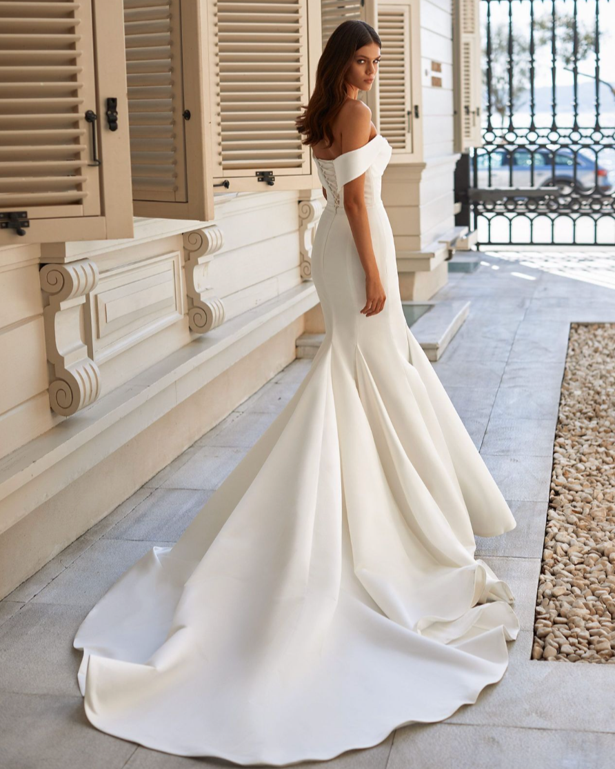 Vestido off shoulder escote corazon, corte sirena y cauda