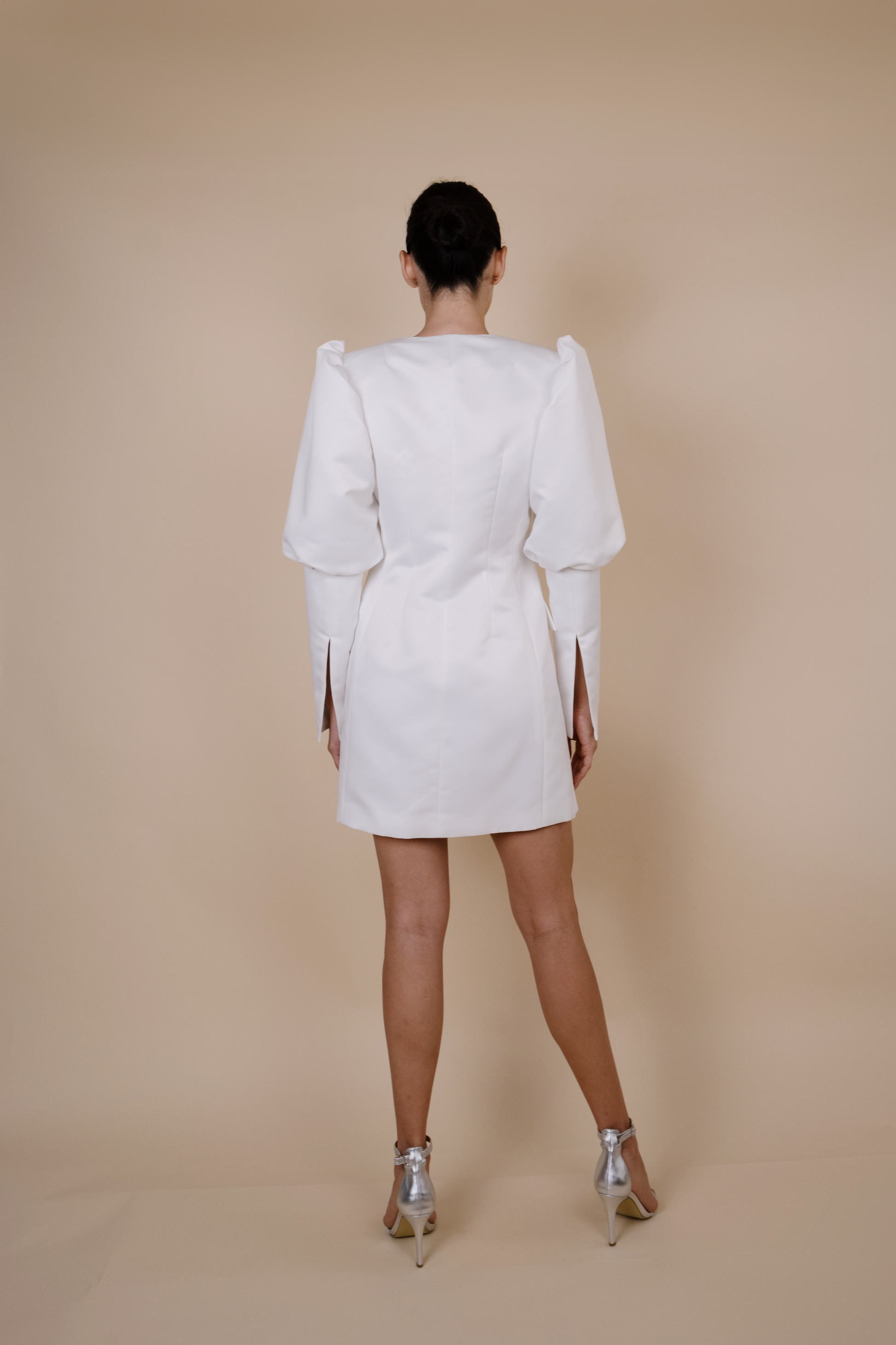 Vestido corto en estilo blazer, con cuatro botones al frente y manga con volumen.