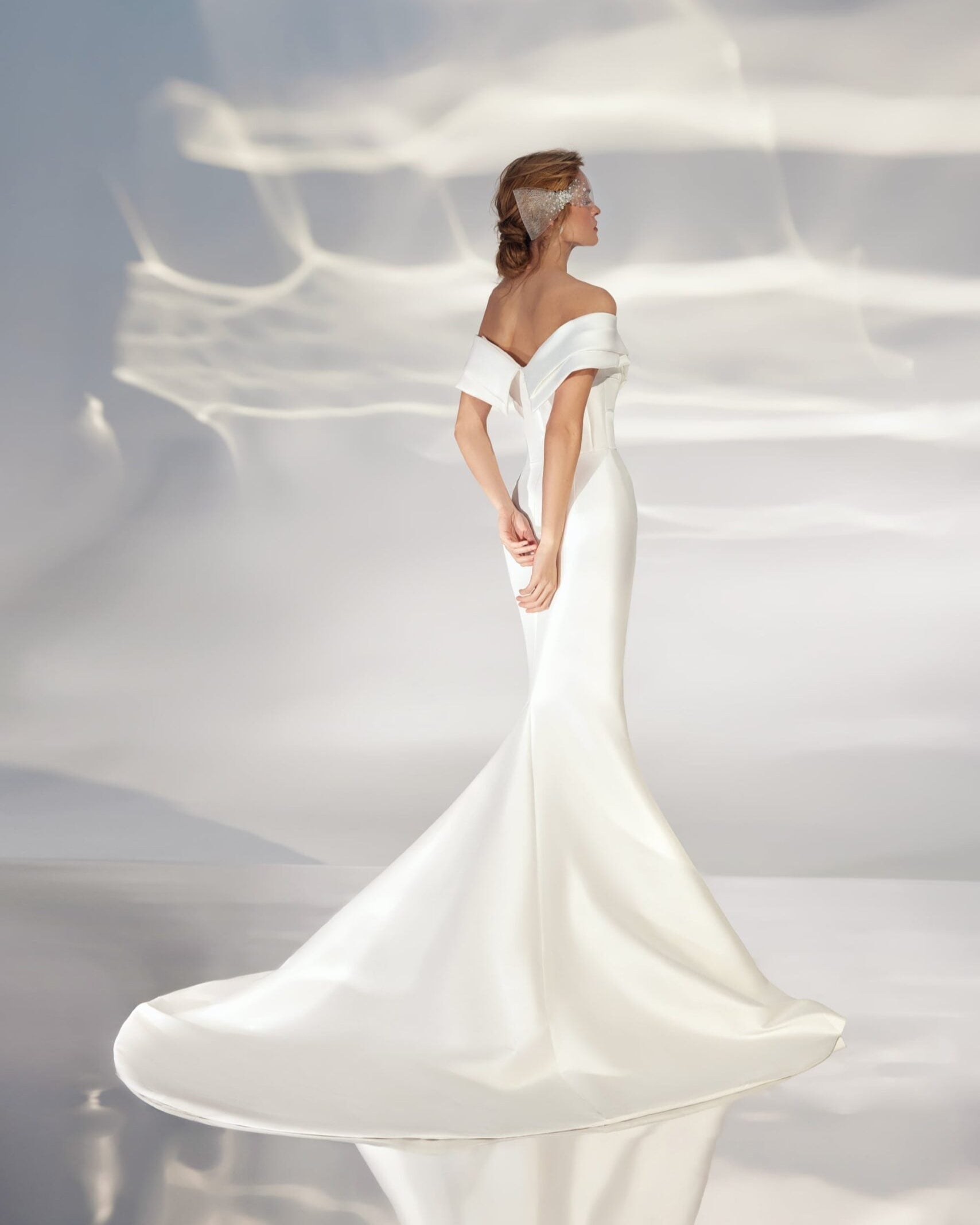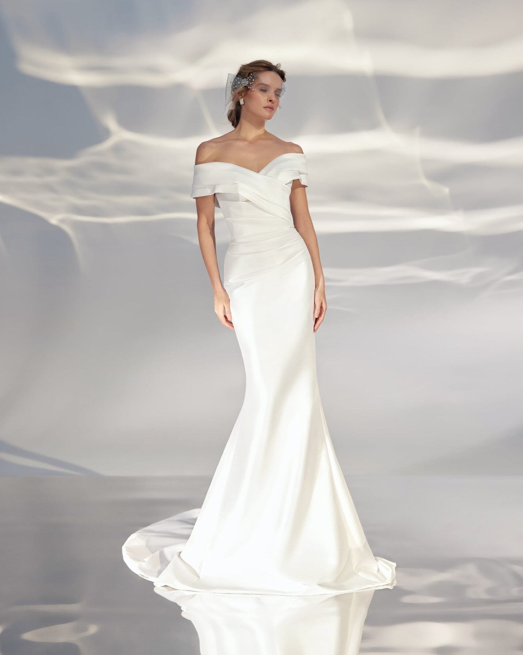 Vestido off shoulders, con drapeado en cintura y corte sirena