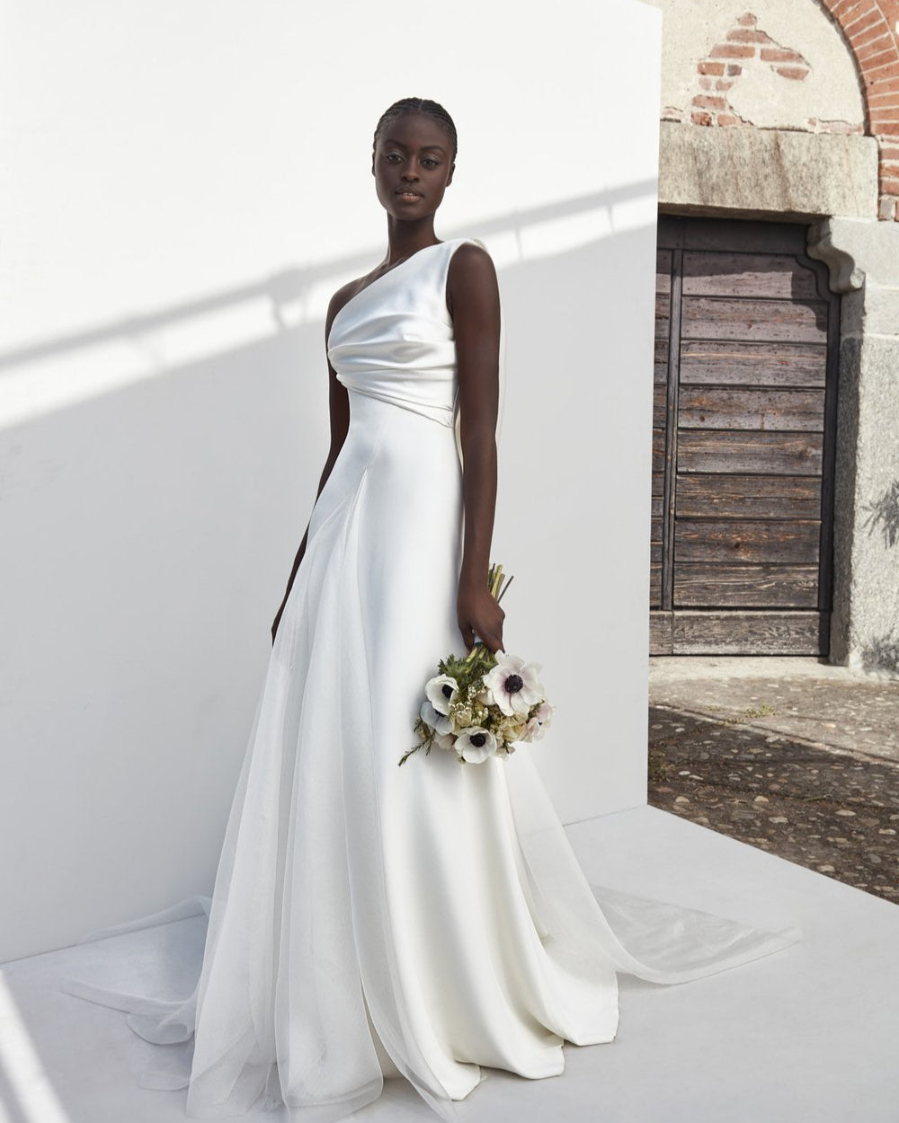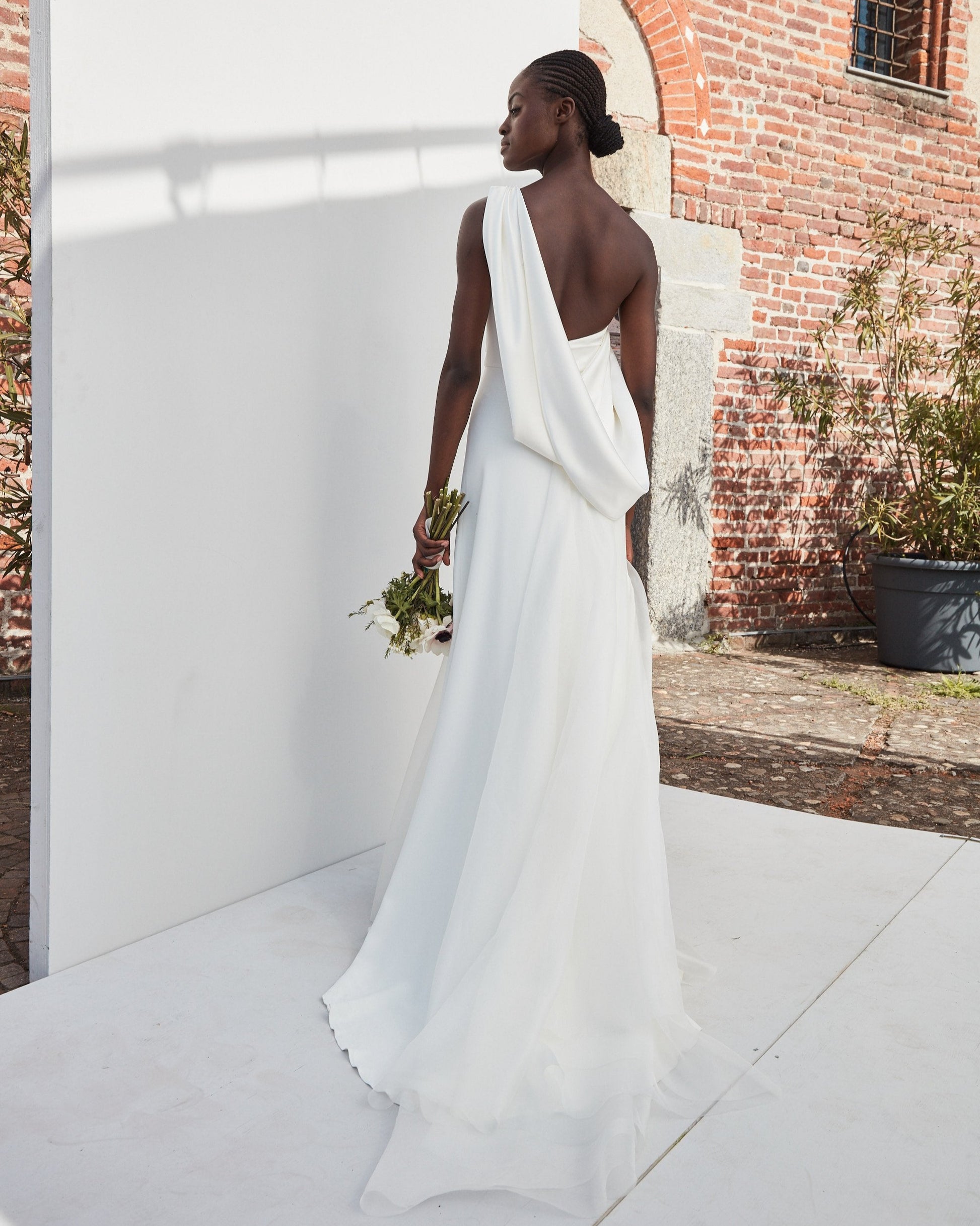 Vestido de satin y organza, one shoulder, detalle de tela en espalda