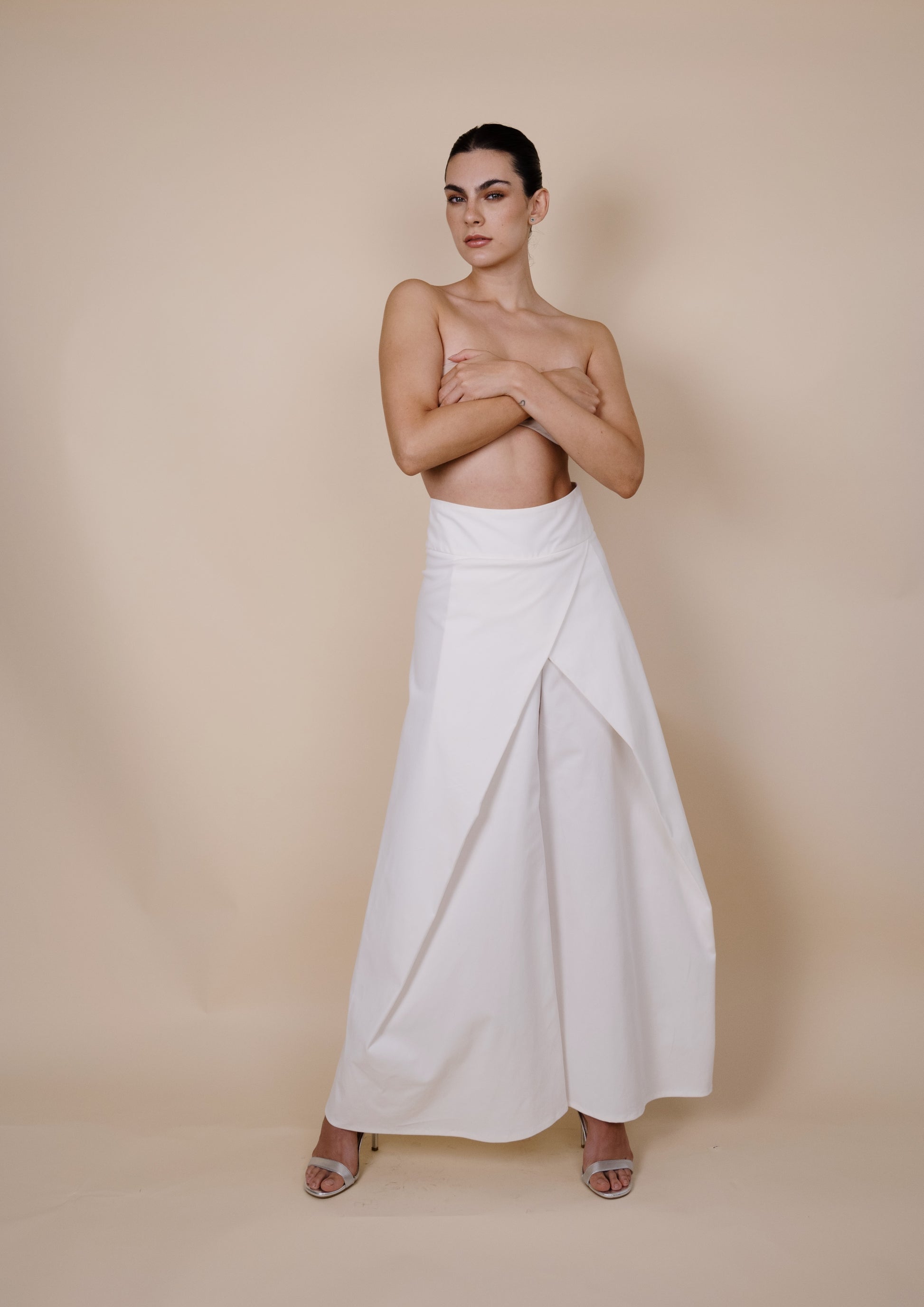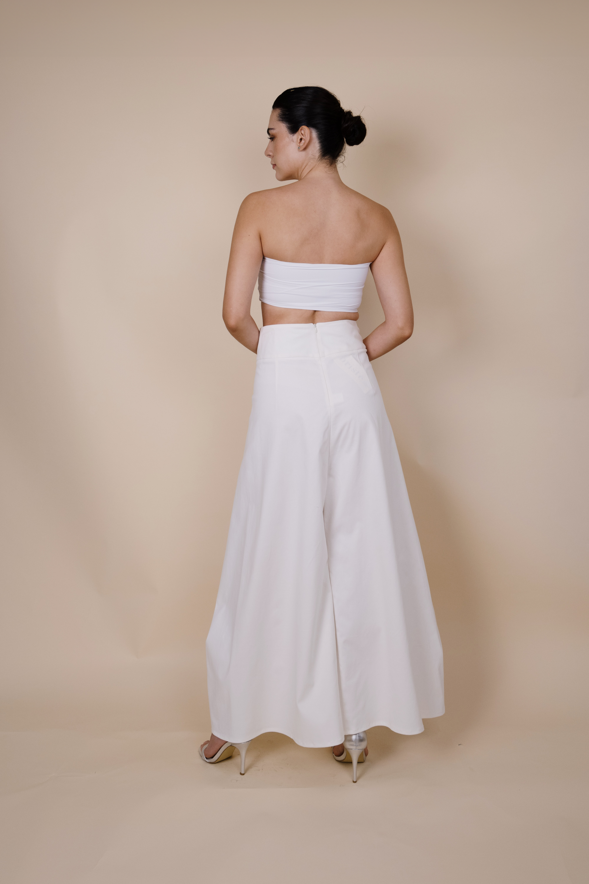 Pantalón maxi de tiro alto color blanco con detalle cruzado.